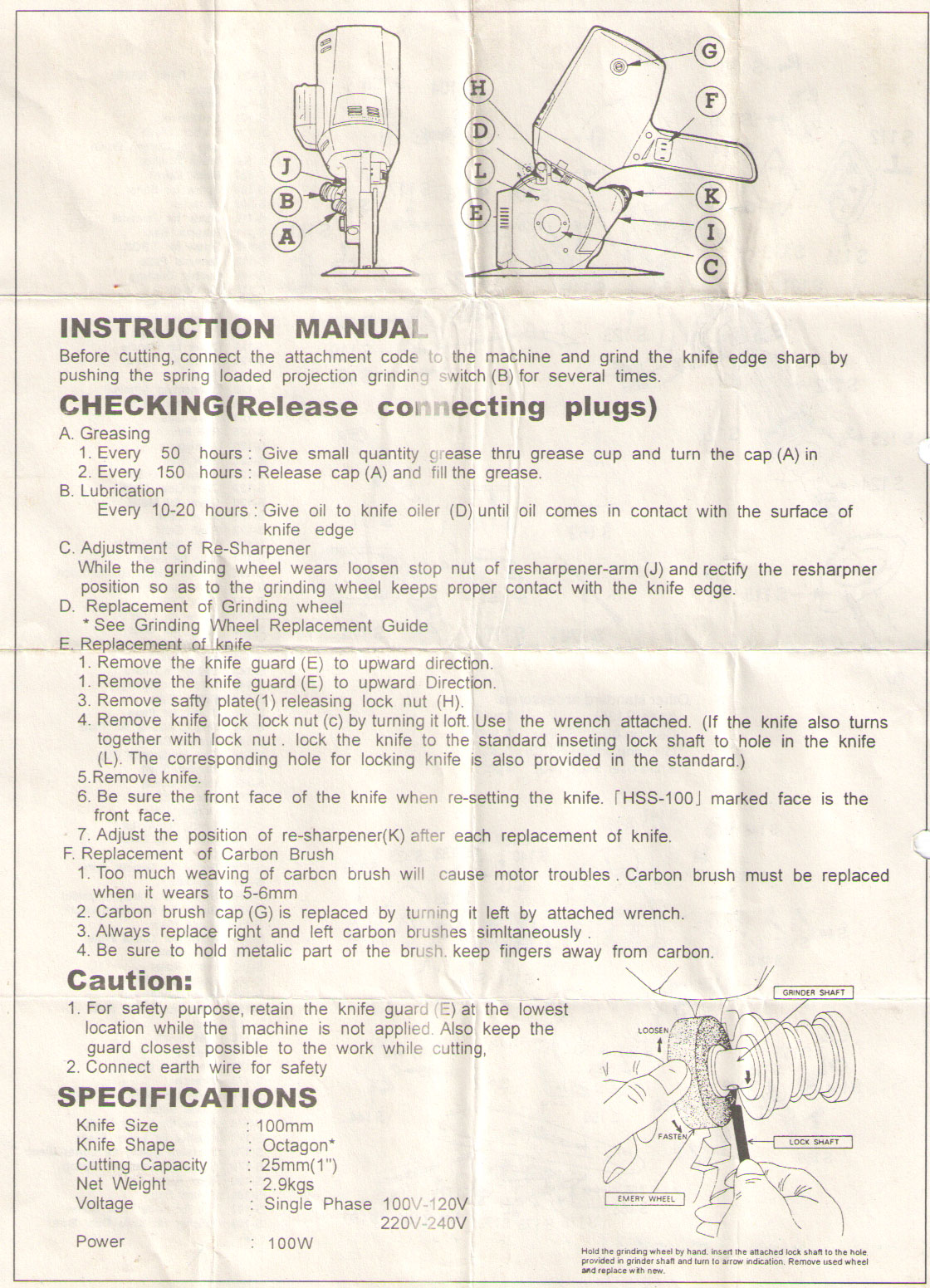 Cloth Cutting Machine Instruction ManualHere some details how to operate this machine. First Click on Photo to open image. Right Click And click on save image as link to save. click here to enlarge.